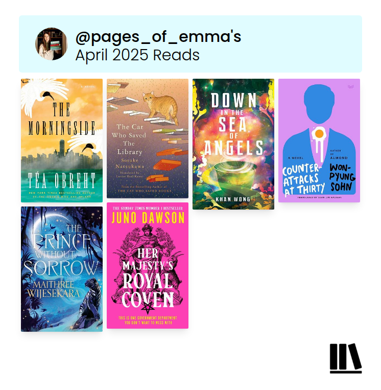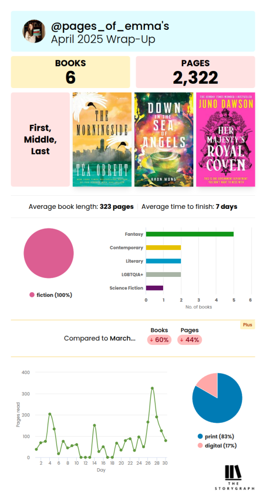 I read 6 books in April, finishing up my reading of The Climate Fiction Prize shortlist, a couple of ARCs, and then mood picking the rest of them. I also read my first book towards the 2025 edition of r/Fantasy Book Bingo too.