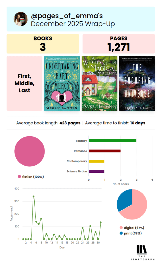 In December I read 3 books. This is apparently my new monthly average! You’ll see from my Storygraph summary that I had a very up and down month for reading. I read a ton over the initial part of my surgery recovery, and then the latter half of the month was spent reading one book while doing all the things with my family and friends.