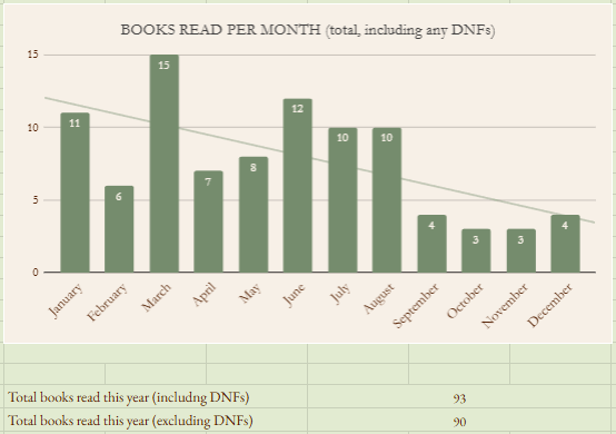 Going a little more nitty-gritty, you can see I actually started 93 books this year, but 3 of them were DNFs. I’m pleased that the number of DNFs is low, as it shows I still have a good handle on what I actually like to read! You can also see very clearly the drop-off in my reading when I started university in September, and I suspect that my new monthly average will remain around 3 books in 2026. You’ll also note there is a discrepancy in the page numbers, and that is because I started tracking the DNFs on Storygraph, so they still register as pages read, even if they don’t count for the books.