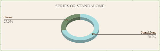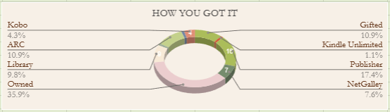 Of the 30% of series books, 12 were first books and 12 were sequels. I finished 3 series and DNFed 2.