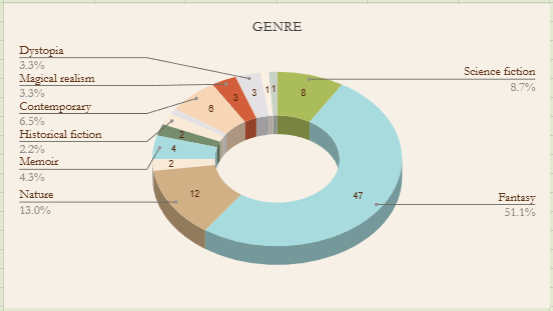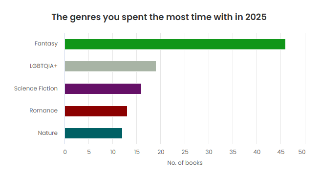 I don’t think anyone is surprised that Fantasy was my most read genre in 2025. Nature non-fiction comes in second, though very far behind, and then it’s sci-fi. Fairly typical for me, since these are the three genres I always list as favourites. I read a few more contemporary books in 2025 and really enjoyed them, so hopefully I’ll keep expanding my genres in 2026!