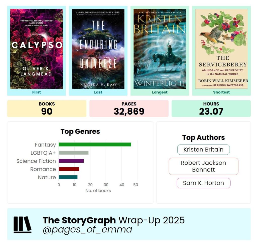 Firstly, an overview from Storygraph. (Come be friends with me!) In total I read 90 books in 2026, a slight increase from 2025. I don’t usually pay attention to page numbers, but nearly 33K is a pretty nice number, and I listened to less audiobooks this year. I am absolutely not surprised that Kristen Britian is my top author, since I reread nearly all of the Green Rider series, which is now at 8 books!