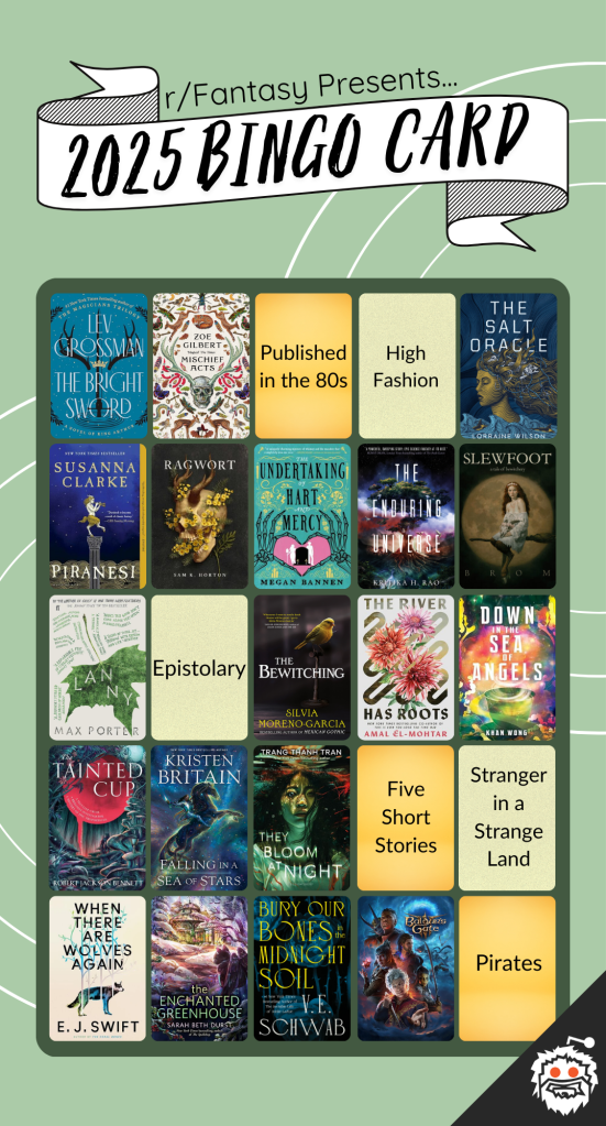 As I said in my 2026 goals post, the only challenge I am doing now is r/Fantasy Book Bingo. 2025’s edition ends on March 31st, and I have 6 books left.