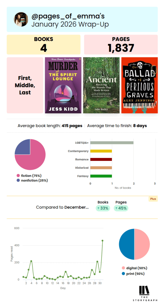 In January I read 4 books. One up from my new average! I found a little bit more of a rhythm with balancing everything in January, and I hope I can continue it. My reading graph is quite funny to look at, I managed to read at least 20 pages every day, and this last weekend I really made an effort to get a couple of books finished.