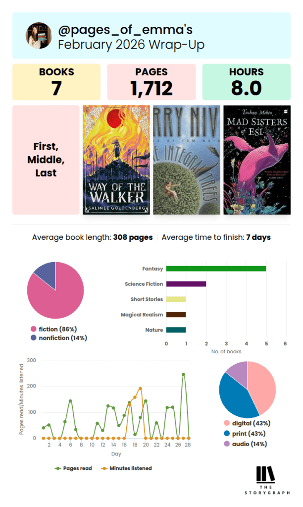 In February I read 7 books! I’m not entirely sure how, but I’m so pleased! As with January, it was a really varied month in terms of genre and format, and I really think that this is the key for me at the moment. There were definitely some books I enjoyed more than others, but it was a pretty solid month overall, and I finished it with a contender for best book of 2026!
