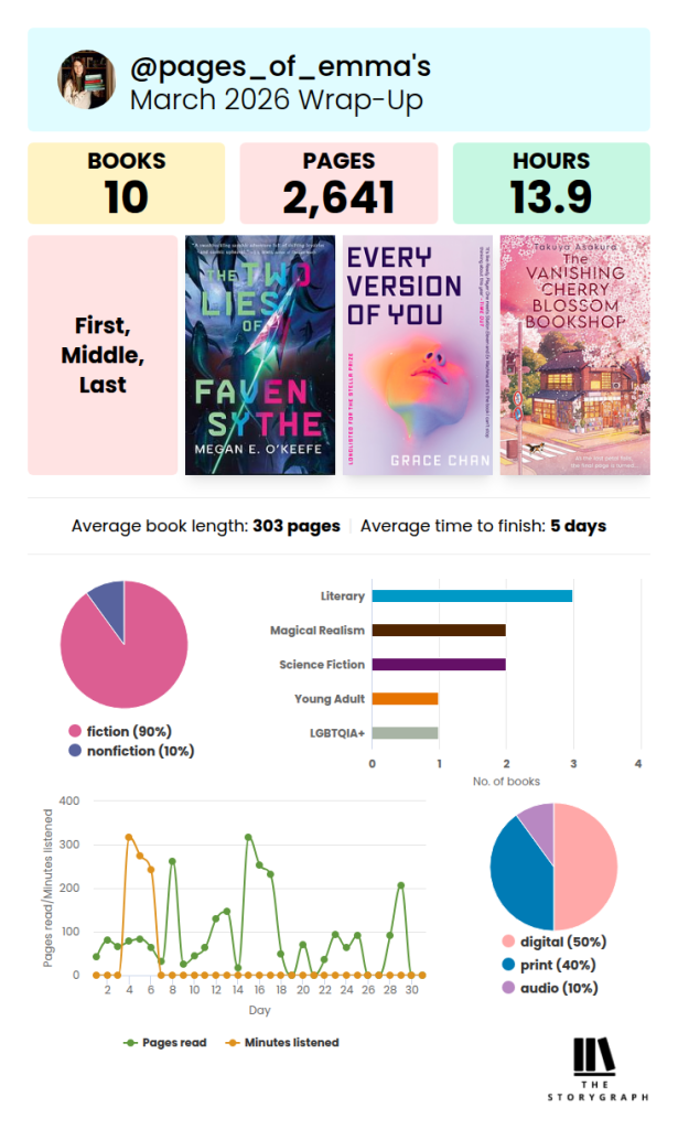 In March I read 10 books! I genuinely have no idea how I found the time, though I guess I used reading as my break from assignments. It was another really varied reading month – I started working through the Climate Fiction Prize longlist, and interspersed that with some non-fiction and a couple of shorter fantasy books. I do have a lot of reviews to catch up on now though…